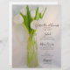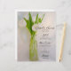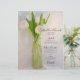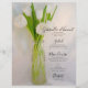 Customise the pretty White Tulips in Milk Bottle Spring Wedding Menu with the details of the meal that you will serve at your engagement garden party, bridal shower luncheon, brunch or marriage reception by adding the salad or first course, entree or second course and dessert or third course. This elegant flowery wedding menu features a floral photograph of a bouquet of white tulip flower blossoms on the stem in a vintage glass milk bottle and a white bridal veil and a white satin background. Perfect inspo for the couple who are planning a classy March, April or May springtime event theme.