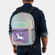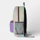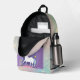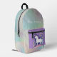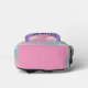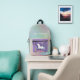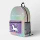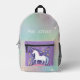 A backpack for that in between time when one is big enough for a big backpack, but still fanciful in thought. This design has a white stepping unicorn on the violet colour pocket with stars. The surface is a pastel gradient gradient sky with white starbursts, and the bottom is a darker pink colour complementing the pink on the bottom of the unicorn pocket. Personalise as you wish. These are very good bags, and it is good to have a printed identification, I think. But I am putting children's surnames on outerwear. You can instruct your child to answer to their first name only to prevent strangers from calling them by their first name.