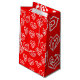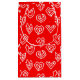 This gift bag has a mid-century modern Valentine’s design of scattered white heart mazes on a field of red.