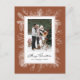 Merry Christmas! This photo Christmas postcard features a vintage-style white botanical frame in fine line art that adds a soft, elegant border around your image. Available in a range of background colours, it pairs beautifully with black and white or colour photos. The simple layout is perfect for holiday greetings, announcements, or seasonal thank-yous. You can add a short message and mailing address on the back. This terracotta botanical holiday postcard is a great choice for family, couple, or pet photos.