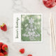 Share a greeting design with party attendees featuring a white Christmas tree ornament and snowflakes over a green background. Personalise the template text fields, remove text and/or click customise to select a font style, size and colour you prefer.