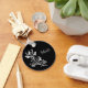 A custom key chain reading Mail with in white letters on black, with a vintage etching of daisies and curling leaves.