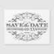 A clean and elegant save the date magnet featuring an intricate black scrollwork flourish frame enclosing bold mixed-serif typography on a crisp white background. The ornate Victorian-inspired border gives this design a timeless, formal elegance that pairs beautifully with any wedding aesthetic. All names and date are fully editable.