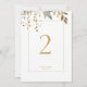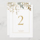Chic and elegant. This gorgeous white wedding table number features watercolor ffoliage detail with imitation gold accents. The design includes a contemporary font in imitation gold set inside a thin golden taupe frame. The design is repeated at the back.