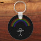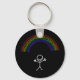 Hand drawn white waving stick man under a colourful rainbow keychain