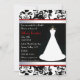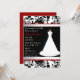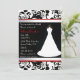 Formal bridal shower invitation done in a black, white damask pattern, on the top and bottom. A lovely wedding dress on a decorative stand decorates the right side of the invitation, and red border edges a white satin looking ribbon, on each side of the black text area. Customise the text to suit your party needs.
