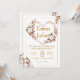 A minimalist white wedding invitation featuring an elegant thin heart, delicate white roses, and soft brown branches.