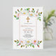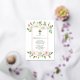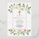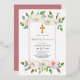 White and pink wild dog rose floral girl rose gold foil First Holy Communion invitation. This design showcases garlands of watercolor white and blush pink dog roses with green leaves on the upper and bottom parts, a rose gold foil cross and your text in a gold frame. The back is of dusty rose pink colour.