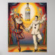 Poster with White Willow Absinthe advertisement and featuring a dancing Jester and Pierrot against colourful background.