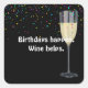 Glass of white wine in stemware with birthday confetti and fun quote on black background.