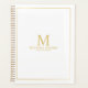 Professional planner features custom monogram, name and text in gold classic serif font style with gold border on white background.