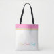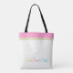 A pretty summer tote bag in white, featuring a top rim of pink orange and aqua . Colourful text of "Sun Sand Surf" included at the bottom. Customise to change text or add initials.