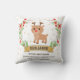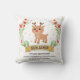 Baby room birth announcement pillow featuring an adorable little reindeer and beautiful red and green floral leaves branch with modern typography. Add all your lovely details on this easy-to-use template to make your own unique birth stats pillow.