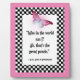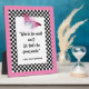 Whimsical digital art features pink background, black and white chequerboard frame, watercolor pink butterfly, and centre quote from Alice in Wonderland which reads: "Who in the world am I? Ah, that's the great puzzle."
