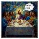 A humorous take on the Last Supper featuring bread, wine and Jesus Christ in the centre, surrounded by disciples, wondering ‘who ate the cakes?’