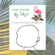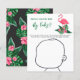 Baby shower invitation design features pink flamingo with lush green palm leaf fronds and tropical hibiscus flowers. "Aloha Baby". A tropical floral pattern with black background colour dresses up the back of the card.