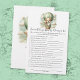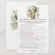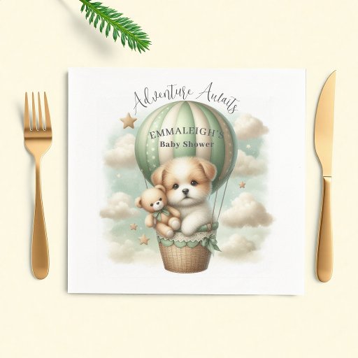 Adventure themed, "How Well Do You Know the Mommy To Be", baby shower game card with an adorable white and tan puppy holding a teddy bear riding in a green hot air balloon. The watercolor green sky has white clouds with surrounding gold stars. Templates on back.
