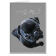 A photo of our black pug, Maya, when she was a puppy. The image was altered with Photoshop filters for a creative look. Maya is looking up with big eyes, as if to say, "Who me?"