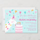 This fun birthday invitation design features a cute whimsical llama with a party hat eating a birthday cake with sprinkles and candles. There are also bunting decorations, and stars and confetti on an aqua background. Personalise this invitation with your own text.