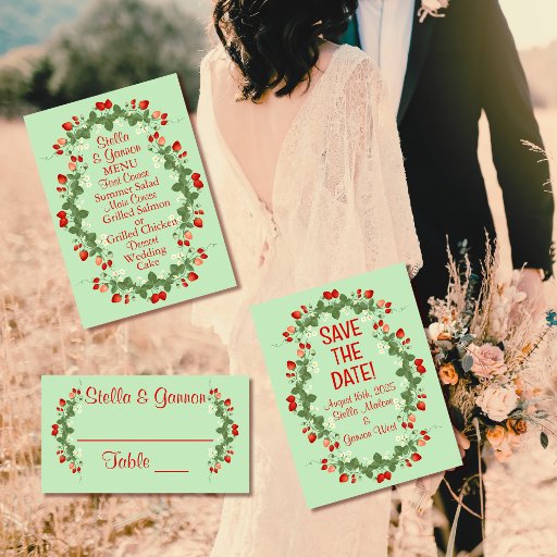 Plump, juicy strawberries on the vine, backed by a light, refreshing green. What could be more perfect for a country / barn wedding in the summer?
