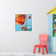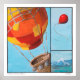 A trio of whimsical images of a mountain, an escaped red balloon flying high with the birds, and an empty hot air balloon are shown in this brightly coloured print of an original tempera painting.