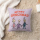 This heartwarming illustration captures the true meaning of Christmas! It features three colorful Whos of Whoville standing together, holding hands, and smiling with their eyes closed, looking like they are happily singing or swaying. They are dressed in unique, whimsical Whoville outfits (pink fringe, purple zigzag, blue stripes). Arching cheerfully above them in bold red text is the phrase: "MERRY GRINCHMAS!" This graphic perfectly embodies the communal and sweet spirit of the holidays!