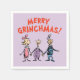 This heartwarming illustration captures the true meaning of Christmas! It features three colorful Whos of Whoville standing together, holding hands, and smiling with their eyes closed, looking like they are happily singing or swaying. They are dressed in unique, whimsical Whoville outfits (pink fringe, purple zigzag, blue stripes). Arching cheerfully above them in bold red text is the phrase: "MERRY GRINCHMAS!" This graphic perfectly embodies the communal and sweet spirit of the holidays!
