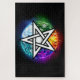 Artistically drawn, luminous pentagram with five magical elements, water, earth, fire, astral, air on black background. Wiccan pentagram. Wicca