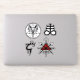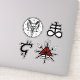 Included are four stickers. They are, from top left to bottom right: Pentagram of Baphomet; the symbol for sulphur used in alchemy; sigil of the demon Mestama, the patroness of witches, hags, and vengeful widows; and the sigil of antinomian power. Use these stickers anywhere you want to enhance your Halloween, Wicca, or dark aesthetic vibe.