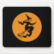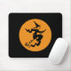A black wicked witch flying in front of an orange Halloween moon on her broom.
