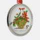 A Christmas ornament features a vintage illustration of a wicker basket overflowing with vibrant red poinsettia flowers and lush holly leaves, evoking the warm and festive spirit of traditional celebrations.