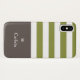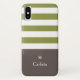 A modern wide horizontal stripes pattern iPhone X Case in pepper stem green and eclipse brown. Personalise by adding your name beneath the chic retro daisy logo.