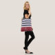 A modern wide horizontal stripes pattern tote bag in navy blue and red. Personalise by adding your name beneath the chic retro daisy logo.