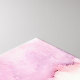 Wide Seascape Mediterranean Purple Serenity. This surreal stylised watercolour and ink scene features a beautiful deserted sandy beach framed by purple flowers on a low hillside. An azure sea lies on the other side, with low hills fading into the distance and puffy purple clouds blending gently, creating a tranquil, relaxing coastal view.