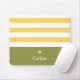 A modern wide horizontal stripes pattern mousepad in yellow and spring green. Personalise by adding your name beneath the chic retro daisy logo.