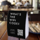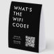 This stylish black paper table tent tabletop sign provides a clean and modern way for customers or guests to access your wifi network instantly with bold typography quote "What's the WiFi Code?". The design features a central QR code area that can be linked to your wifi details so users can scan to connect without typing a password. Enter your network name and any custom instructions that fit your need. The minimalist layout keeps everything readable which works well for cafes, salons, studios, offices, rental properties, pop ups or event venues. Because the template is fully editable, it adapts easily to branding updates or new wifi information. A practical and polished solution that helps streamline customer access and elevates your in person experience.