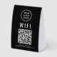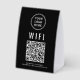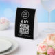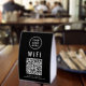 Make it easy for clients and guests to get online with this black WiFi QR Code Table Sign, a sleek and practical addition to any café, salon, restaurant, Airbnb, office, or waiting room. Designed for convenience, this modern paper sign lets visitors scan the QR code to instantly connect—no need to type long network names or passwords. This lightweight tabletop display is perfect for placing on counters, reception desks, or tables. The clean black-and-white design with bold text and clear layout ensures the QR code is easy to scan and read at a glance. Customize it with your WiFi qr code, network name, password, and brand logo to create a polished, professional look that matches your space and keeps your guests happy.