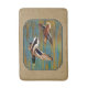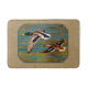 Male and female mallard ducks in flight over a golden pond, water rippling to reflect the colours of the background autumn foliage glowing in the sunlight. All on a matching earth-toned sandy brown background.