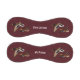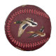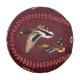 Male and female mallard ducks flying, on a sophisticated maroon patterned background.