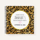 A bachelorette party guest book, spiral notebook with a stylish pattern. Exotic black leopard spots on a gold background. Wild yet elegant style. Layered over top is a white circle frame with a faux gold foil border, with your personalised text inside.