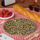 Paper plates with a stylish pattern. Exotic black leopard spots on a gold background. Wild yet elegant style.