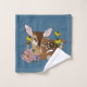 A baby deer fawn snuggles up to wild flowers and mushrooms all in a backdrop of blue