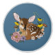A baby deer fawn snuggled up to wild flowers and mushrooms are all in backdrop of blue