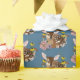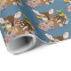 A baby deer fawn snuggles up to wild flowers and mushrooms all in a backdrop of blue