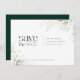 Wild Forest Greenery, wedding save the date card. Modern Simplicity Typography with elegant watercolor forest foliage and golden accents with emerald green colour backing.