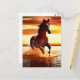Postcard in a portrait of a beautiful wild horse galloping through the surf, against a sunset sky