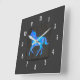A clock with a cool looking watercolor horse in blue and purple colours. Set on a charcoal grey block of wood with a charcoal grey background. Whote art deco style clock face numbers.