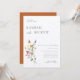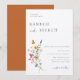 Wild Meadow Floral, Wedding Invitation. Colourful watercolor wildflower bouquet with coordinating orange colour backing.