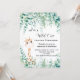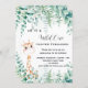For baby's 1st birthday. A white background. a cute little baby giraffe and eucalyptus greenery and woodland ferns. Personalise and add the name and party details. Text: Wild One