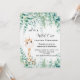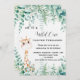For baby's 1st birthday. A white background. a cute little baby giraffe and eucalyptus greenery and woodland ferns. Personalise and add the name and party details. Text: Wild One